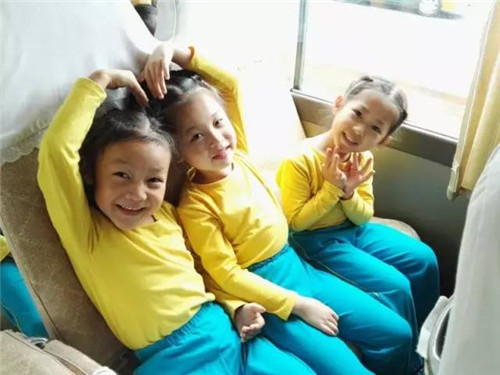 在車上,興奮的孩子們説説笑笑。