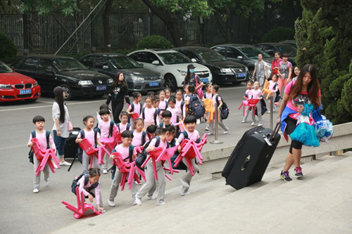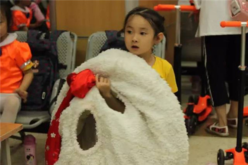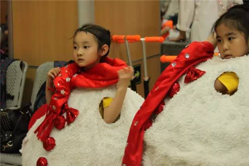 上場前,自己能穿好的演出服裝自己穿,難一點的服裝,老師幫着穿,一點都不費勁。據説,有的小朋友串場表演,在老師的幫助下,換一個服裝最快速度是15秒!