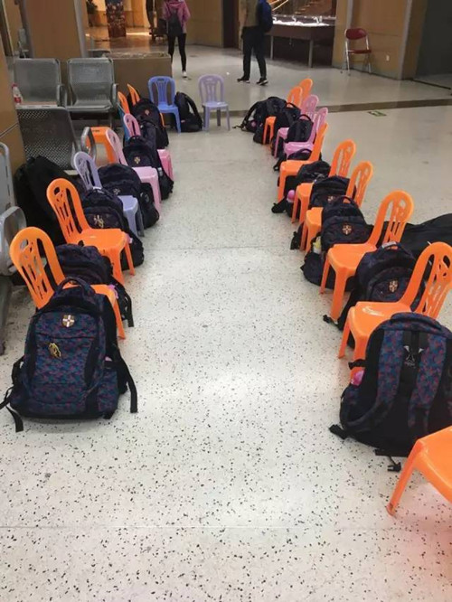 上場表演時,孩子們的書包和小椅子整整齊齊。
