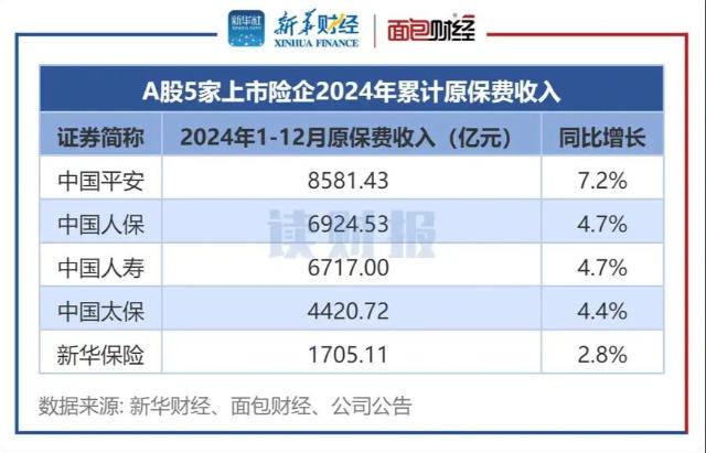 具體來看,中國平安2024年累計實現原保費收入8581.43億元,同比增長7.2%;中國人保實現原保費收入6924.53億元,同比增長4.7%;中國人壽實現原保費收入6717億元,同比增長4.7%;中國太保實現原保費收入4420.72億元,同比增長約4.4%;新華保險實現保費收入1705.11億元,同比增長2.8%。