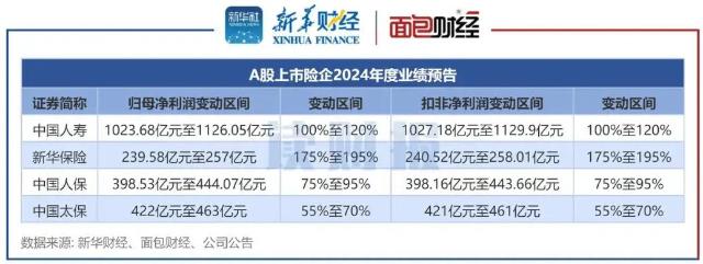 近期,中國人壽、新華保險、中國人保、中國太保4家A股上市險企披露了2024年度業績預增預告。