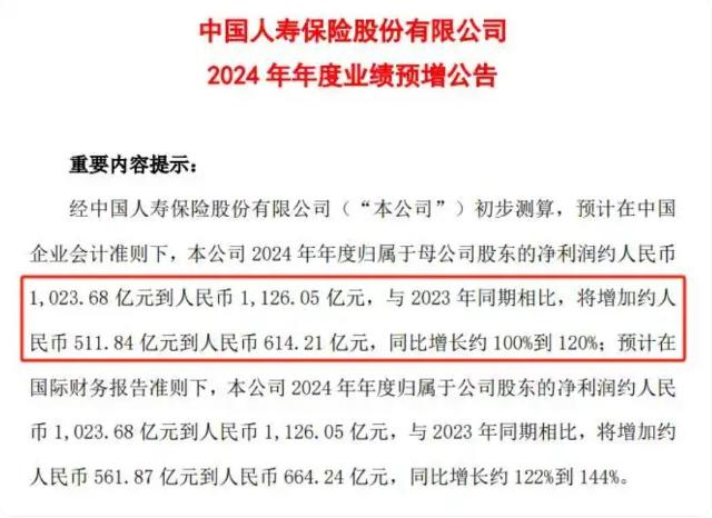 中國人壽公告顯示,在中國企業會計準則下,公司2024年年度歸母凈利潤約1023.68億元到1126.05億元,與2023年同期相比,將增加約511.84億元到614.21億元,同比增長約100%到120%。