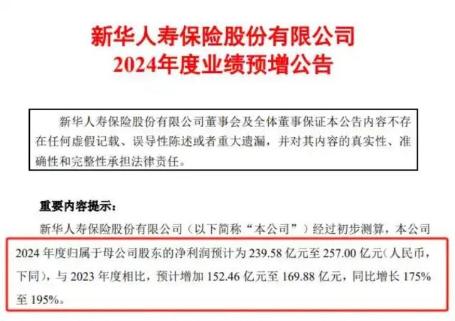 新華保險公告顯示,公司2024年度實現歸母凈利潤預計為239.58億元至257億元,與 2023年度相比,預計增加152.46億元至169.88億元,同比增長175%至195%;實現扣非凈利潤預計為240.52億元至258.01億元,與2023年度相比,預計增加153.06億元至 170.55億元。