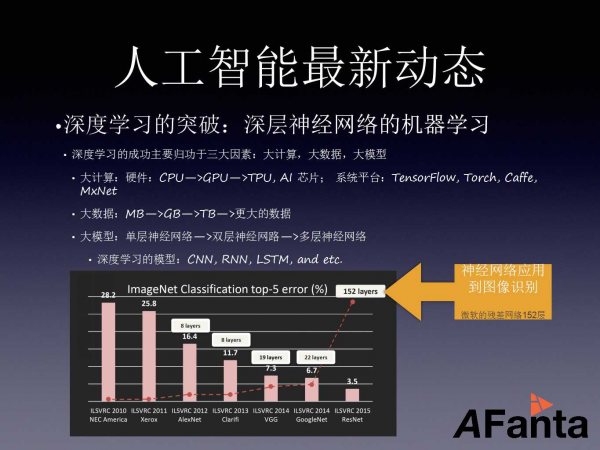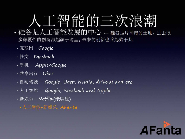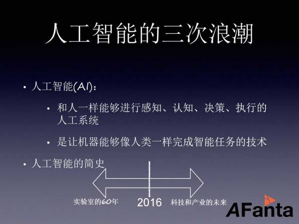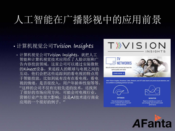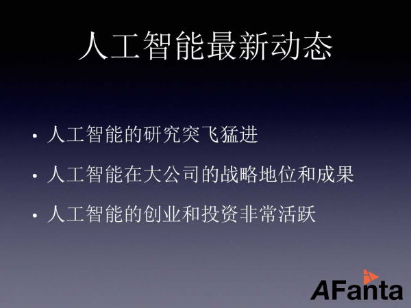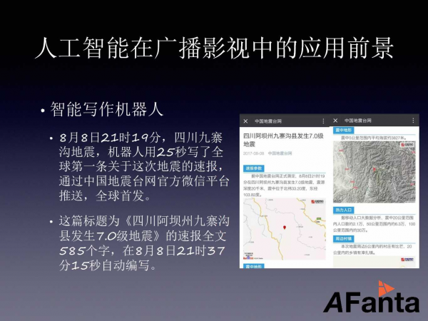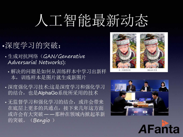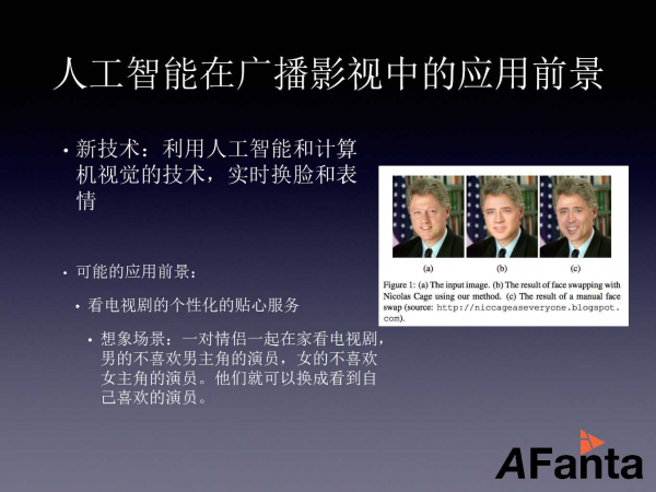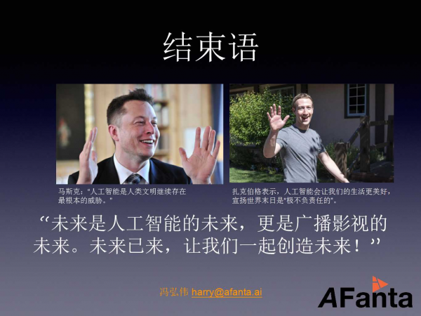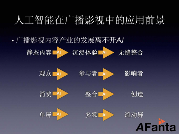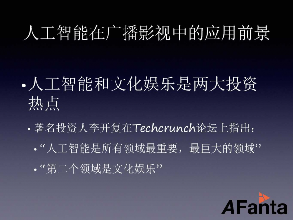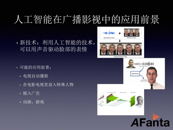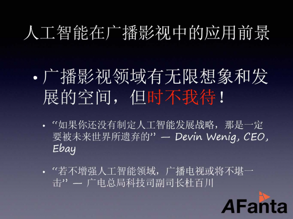 8月22日,BIRTV主題報告會在北京國際飯店盛大召開。矽谷Afanta公司聯合創始人,總裁馮弘偉發表了關於無限想象的空間——人工智慧AI的發展狀況以及在廣播影視中的應用前景的演講。講述了人工智慧的發展,人工智慧的最新動態,以及人工智慧在廣播影視中應用的前景。