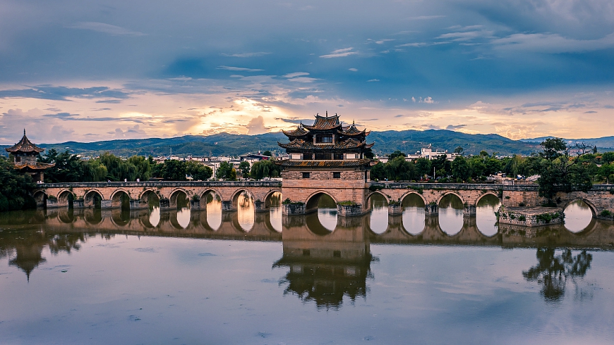 雙龍橋,坐落於建水古城西5公里處,橫跨瀘江與塌衝兩河交匯之水面上,因兩河蜿蜒盤曲如雙龍而得盛名;該橋清乾隆年間先建三孔,道光十九年(1839年)續建十四孔與原建三孔首尾相連、雁齒蟬聯、合為一體,故又稱“十七孔橋”,是我國古橋建築藝術的佳作。2006年,雙龍橋被國務院列為國家重點文物保護單位。