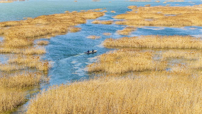 江蘇宿遷:洪澤湖濕地蘆葦搖曳碧波蕩漾