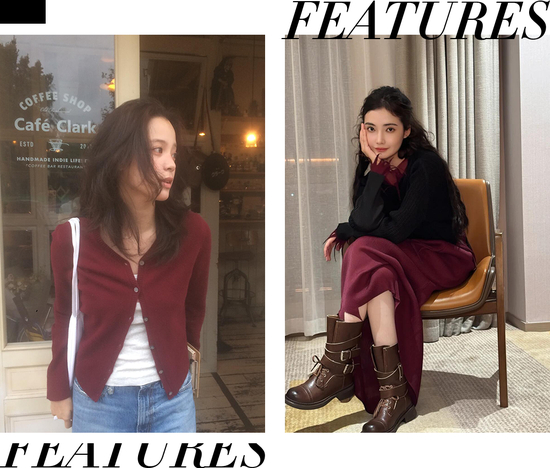 酒紅色要怎麼穿才不顯老氣?答案是控制面積和選對款式。一整套酒紅色對大多數人來説都難以駕馭,但一件酒紅色針織開衫或者一條半裙就友好得多。