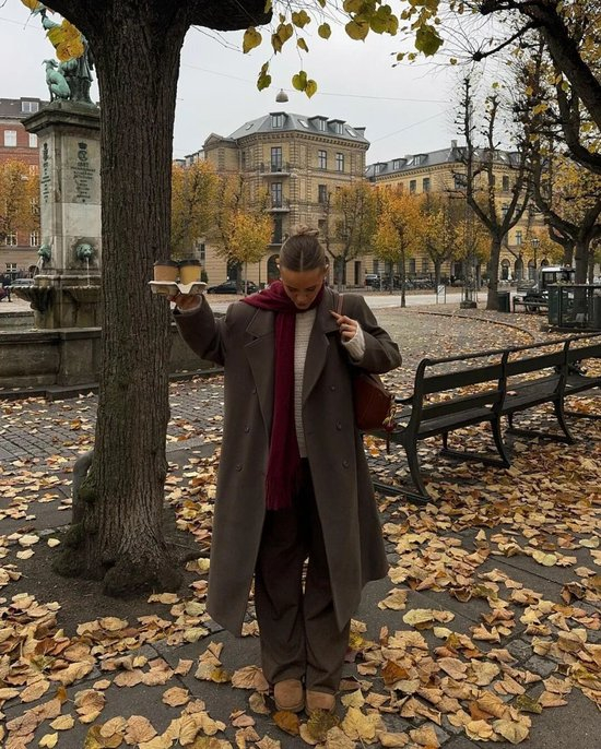 更簡單的辦法是把酒紅色作為點綴色使用:在全黑造型里加一條酒紅色圍巾,在駝色大衣外係一條酒紅色腰帶,或者背一隻酒紅色的小包,甚至是酒紅色美甲。這些小巧思能讓你的穿搭立刻有重點,又不會過於張揚。