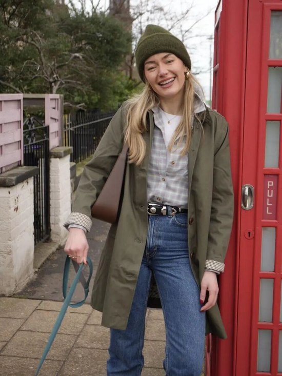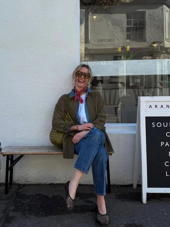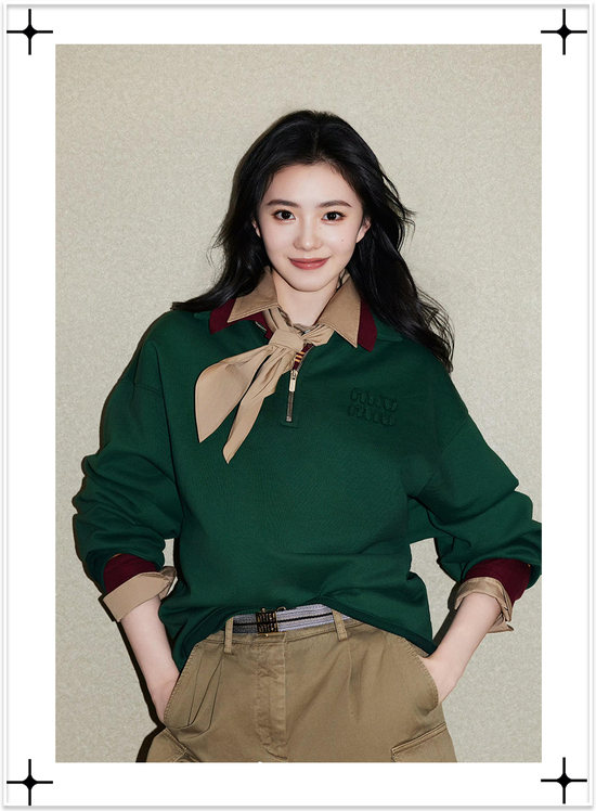 作為外套搭配簡單的牛仔褲,顯白又提氣色;綠色針織衫也是實用之選,單穿溫柔,當作內搭提亮整體造型。