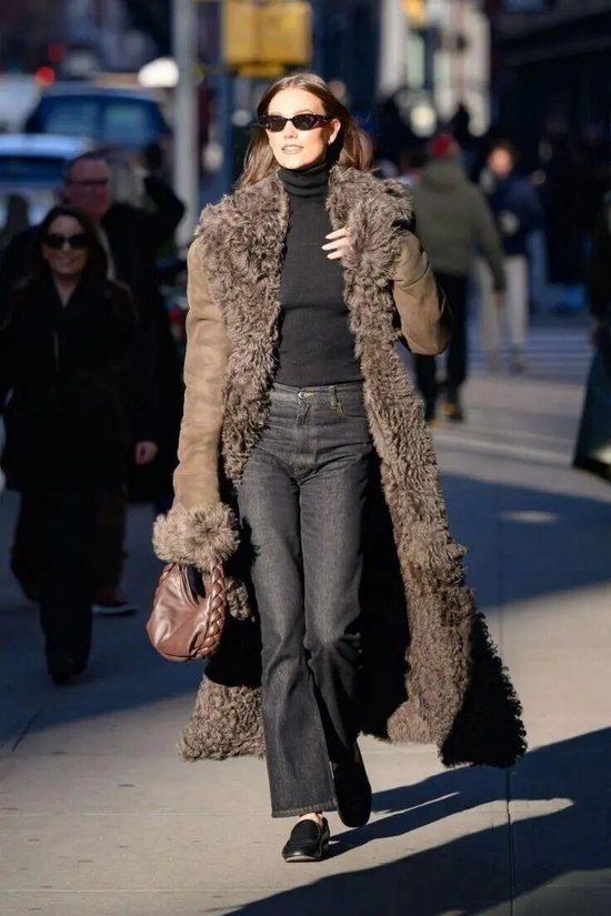毛毛元素如何穿得不顯臃腫?關鍵在“局部使用”。一件皮質夾克內襯換成羊羔毛,保暖度升級的同時保持了外套的利落輪廓。