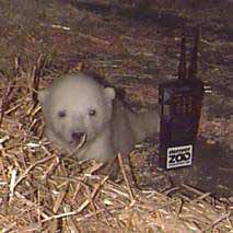 隆冬時節(12月份至翌年的1月份),母熊便在自己建造的洞穴中分娩了,一般為雙胞胎,偶爾是單胎或3胎。剛生下的熊仔光禿禿的,雙眼一抹黑,雙耳聽不見聲音,體重僅有幾百克重,相當於母熊體重的1%左右。出生之後,生長得相當快,經過3~4個月的哺乳,即可長到9~13.5公斤,而在此之前,母熊則與熊仔朝夕相處,形影不離,駐守洞穴中,並完全依靠體內貯存的營養維持自身生命,而且還要哺乳熊仔。北極熊乳汁的脂肪含量高達30%以上,這是任何食肉動物所無法比擬的,因此熊仔才能發育良好,3~4個月後,母熊便攜子離開洞口,讓其外出見世面,長見識,晚上領着它們回洞過夜。