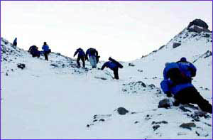 又是一座雪山,這個坡度更陡,幾乎是直上直下,而且高多了。我們幾個年輕記者走到山腳下,心裏直犯嘀咕: “這玩意,上去嗎?不就是看冰川嗎?”老高看出了我們的心思,就激我們:“70多歲的地質學家劉東升5年前就爬過這座山,小夥子們上吧!”我們只得爬(是真正的爬行)了一陣,這個累啊,幾乎沒有很實在的落腳處,山坡上有一些裸露的石頭,但是踩上去就往下滑,讓人心驚膽戰。張繼民依然爬在最前面,而且速度很快。中央電視臺的一個記者豎起大拇指:“你們的老張,牛,佩服!”