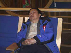 由於連日困乏,北極科考探險隊隊長高登義教授坐在椅子上熟睡了。(侯軍攝)