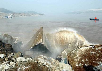 新華社武漢10月30日電:10月30日,被拋投到三峽工程二次截流上游龍口的混凝土四面體激起巨大浪花。當日,承擔三峽工程二次截流的葛洲壩集團公司在二次截流上游龍口成功地進行了截流特大塊石串和混凝土四面體拋投試驗,為截流正式實施提供了寶貴的施工經驗。據悉,這次試驗所用的特大塊石單體重量均在10噸以上,混凝土四面體單體重為20噸,是專為龍口合龍而準備的。(記者 杜華舉攝)