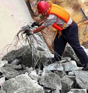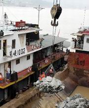 今天上午8點,承擔截流施工任務的中國葛洲壩集團三峽建設公司首先在三峽壩區楊家灣碼頭向載重達500噸的駁船吊裝合金鋼網石兜。上午10點,吊裝完畢,駁船開至導流明渠截流施工現場。上午11點10分,各項準備工作就緒,正式開始拋投試驗。11點30分,拋投順利完成。這次試驗採用底部可以開啟的駁船,將16個合金鋼網石兜平拋入導流明渠,拋投總重約為160噸。這次拋投試驗採用GPS全球衛星定位儀測量拋投精度。通過試驗,進一步論證了採用底開駁平拋施工的可行性,初步測量出合金鋼網石兜在不同流量、流速水文條件下的漂距參數,測定了各工序間的銜接及設備配套能力。
