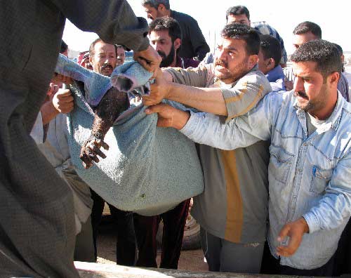 新華社消息:4月6日,在伊拉克首都巴格達以西的費盧傑,人們將一名在衝突中被打死的男子抬走。當天,駐伊美軍在費盧傑和拉馬迪與當地武裝人員發生激烈交火。數十名伊拉克武裝分子襲擊了位於安巴爾省拉馬迪的美海軍陸戰隊陣地,至少有12名海軍陸戰隊員被打死。