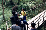5月14日下午,一行人剛爬到吊橋上,雨點劈哩叭拉地打了下來。“撤!”導演欒殿湖一聲令下,大家迅速下樹、下車,打道回府。車開走不久,雨過天晴了。“回去!”導演一聲令下,一行人又回到森林深處,爬樹上橋,架上機器,開始拍攝。不一會兒,一大團烏雲飄移而來,猶豫之間,雨下來了。“又泡湯了!”大家又下了樹。車開出去半個多小時,又一次雨過天晴。這時候,大家都感到這雨是有些故意了。怎麼辦呢?此時回宿營地就意味着一天的拍攝計劃落空。“回去!”製片人金越下了決心。大夥又回到望天樹上,在雨的間隙完成了拍攝。在他們上車離去之後,又一場大雨漂潑而下。 |