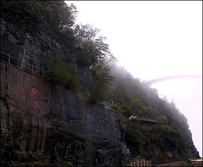 彩虹橋下高大的陡壁上有四個大字“古峰望顏”,由於年代久遠風化嚴重加之有雨水已不好辨認,但如那座彩虹橋一樣,筆力逑勁,氣勢依然。