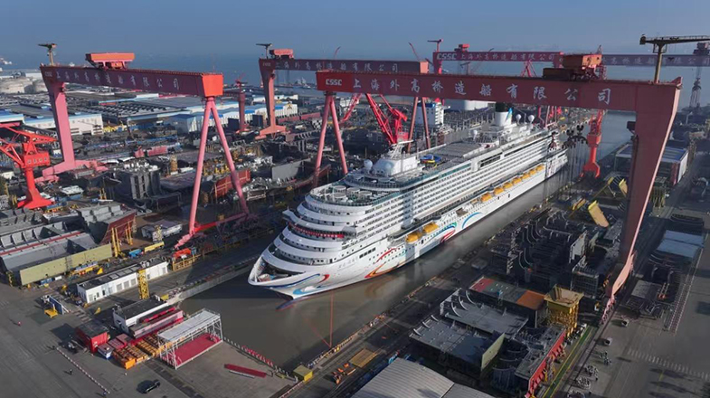 第二艘國産大型郵輪“愛達·花城號”3月14日完成了塢內注水,順利起浮。