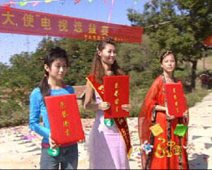 現場主持人:做咱的形象大使,不僅要形象好、懂得多,還要手巧,這也叫心靈手巧嗎。現在正值瓜果飄香的季節,咱沂山風景區內,也是碩果纍纍,瞧見沒有,我身後的山楂也熟了,為了考驗選手的動手能力,我們決定着一關進行採山楂比賽,大傢伙兒説好不好?