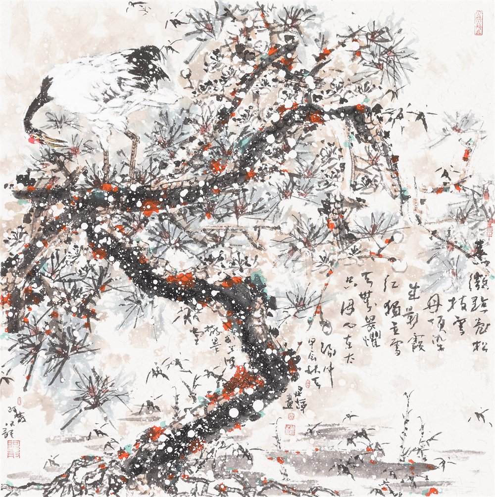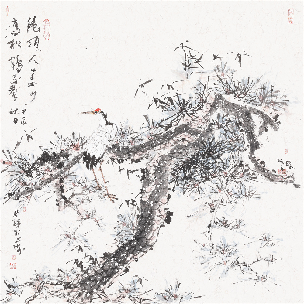 熹微松枝雪, 丹頂映霞紅 紙本水墨 42cmx42cm