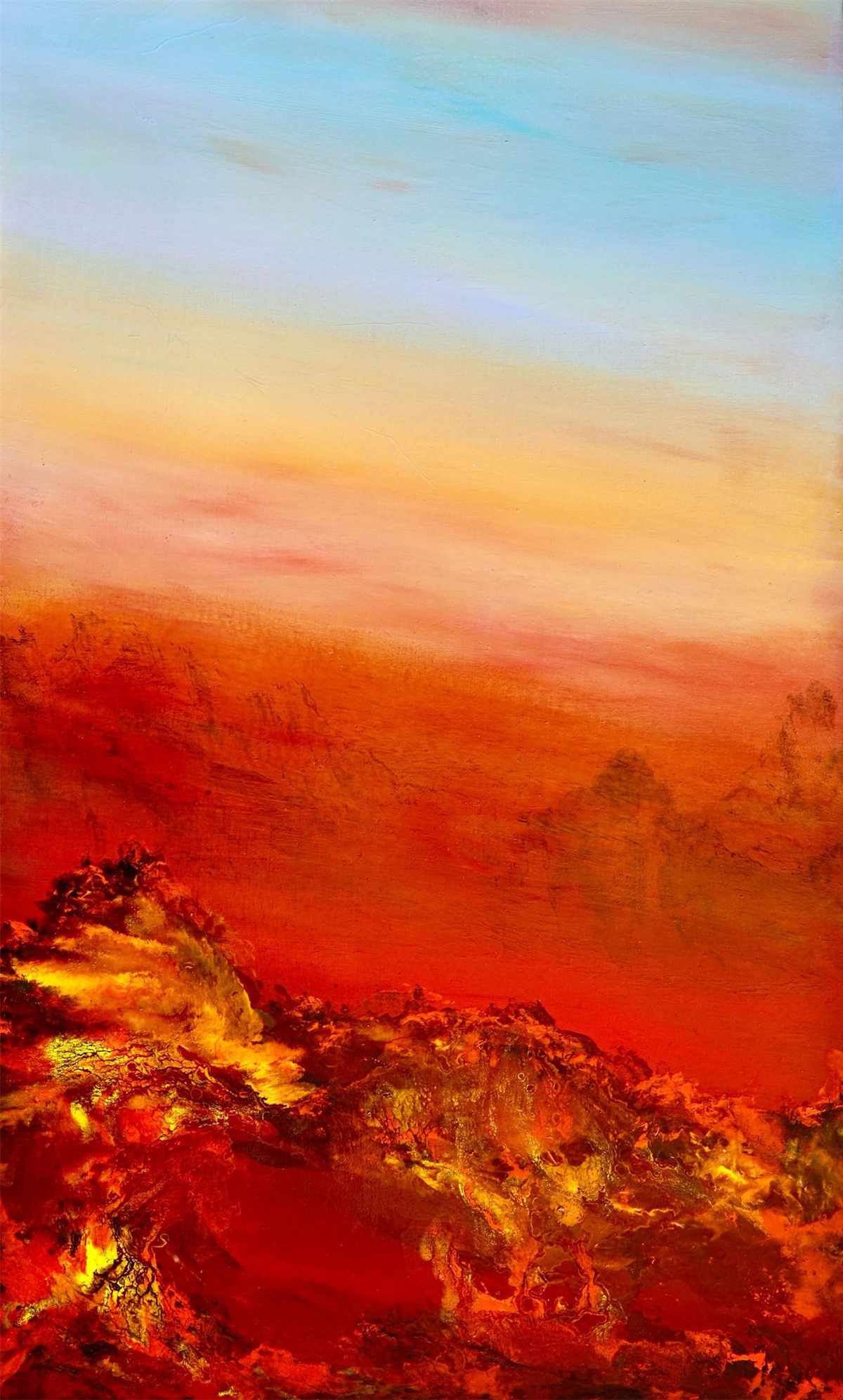 陸永安的作品是深度與深刻的情感表達,色彩用得鮮明,很磊落。其所反映出來的不是一山一石、一草一木那種特別具象的描畫與刻畫,而是將內心對自然的感受昇華和煥發出來的一種語言。這種語言有效地表達了他對東方大自然景象乃至宏觀大境界的一種認識。